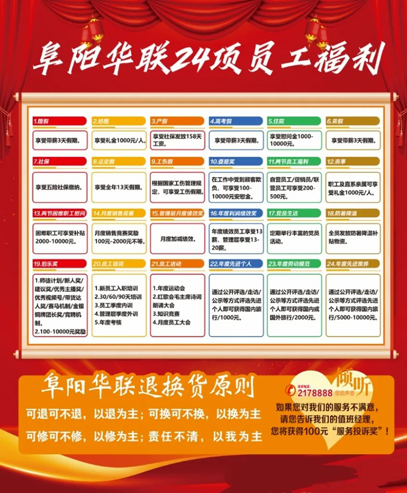然而,更深層的真情體現(xiàn)在企業(yè)內(nèi)部的3000余名員工身上。在阜陽華聯(lián)總部,清晰展示著一項特殊記錄:多年來,企業(yè)為員工系統(tǒng)化創(chuàng)設并陸續(xù)完善了24項福利政策。這份清單遠不止法定的社保,它細致地涵蓋了健康關(guān)懷、生活保障、成長激勵、禮金慰問,以及長期的貢獻認可。
